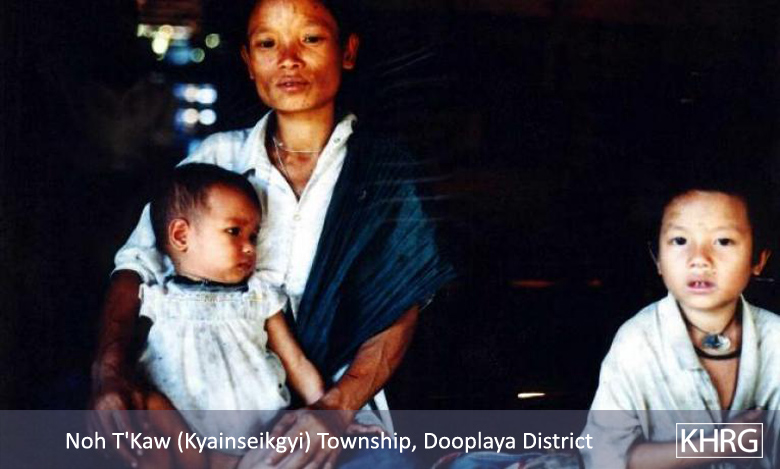 Photo #7: Yaw Doh village, Kya In Township, Dooplaya District, central Karen State (just north of Kyaikdon). On 27 October 1996 a column of SLORC troops from IB #31 attacked the village in order to loot it, but were driven out by KNLA troops who arrived after they had begun. They took the village headman and many others with them as porters, and led away 2 villagers on ropes to be executed at their camp. This woman’s husband was tied up, led away and executed several days later at the IB #31 camp, leaving her and their 2 children. This photo was taken 2 weeks later. [Photo: KHRG]