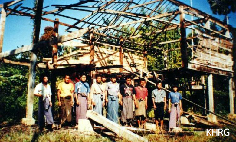 Photo #84: Villagers in front of the Roman Catholic Church in Ler Pa Doh village, burned by SLORC troops in November 1996. [Photo: Karen sources]