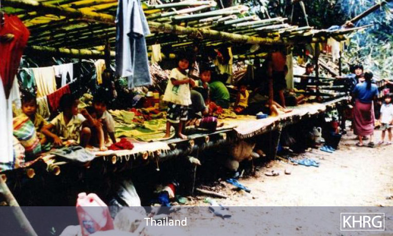 Photo #88-95: Villagers who made it to KNU area, then had to flee a SLORC offensive in the area to Thailand. They are now living in these makeshift shelters in a narrow gully just 1 km. inside unprotected Thai territory, very vulnerable to attack but not allowed by Thai authorities to move further inside Thailand or to build more permanent shelters. Thai forces in the area are positioned further inside Thailand than the refugees - stopping the refugees from escaping, but doing nothing to defend the Thai border. [Photos: KHRG]