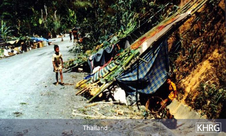 Photos #108-11: Newly-arrived Karen refugees camped along the roadsides and in the drainage gutters at Ka Hee Pa Leh in Thailand in mid-February. About 6,000 new refugees were camped along the road. Thai authorities would not let them build shelters away from the dusty, heavily-trafficked road, and would not let them move into the new refugee camp at Nu Po until a month later. [Photos: KHRG]