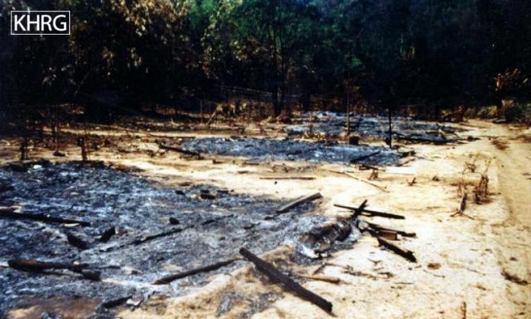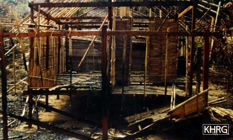 Photo #105: The Karen village of Lay Po Hta, which also acted as a refugee camp though it is not in Thailand, after the last villagers had evacuated and passed through. Ten minutes after this photo was taken, the main SLORC attack force began shelling the western end of the village with mortars. The next day they occupied it, and they have since set up a main base there where captured villagers have been seen doing forced labour as porters. [Photo: KHRG]