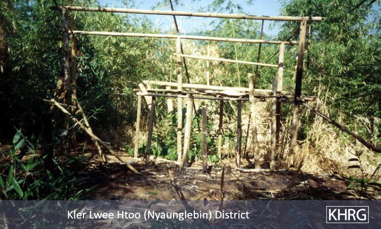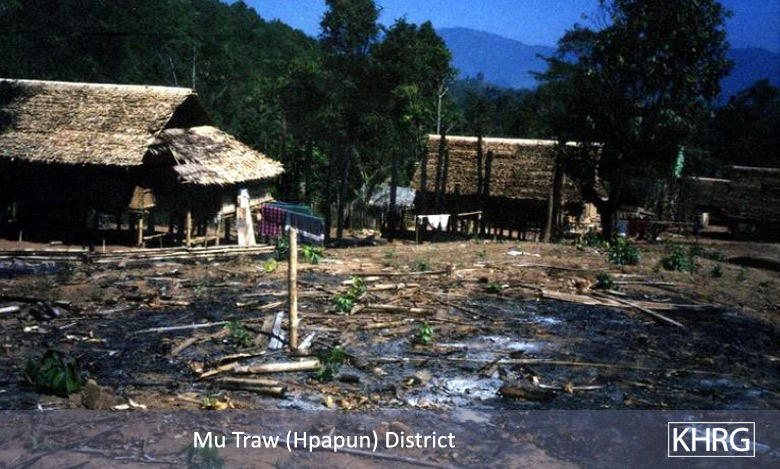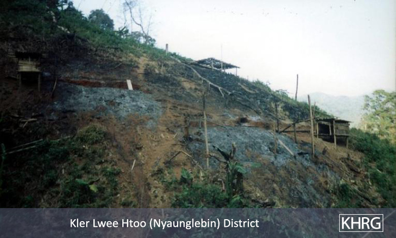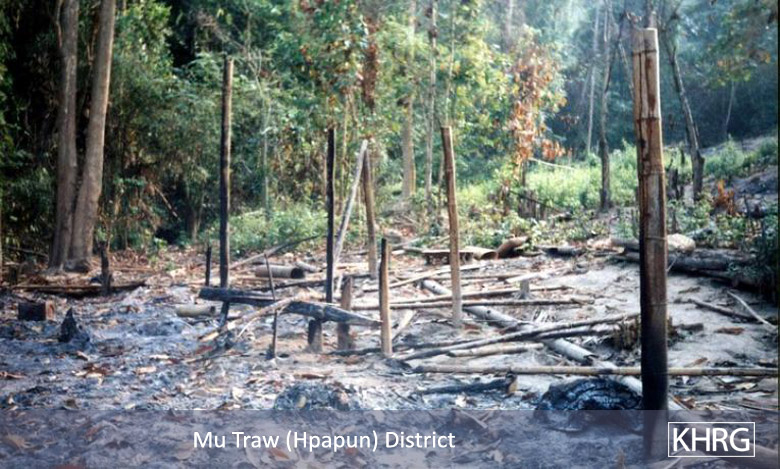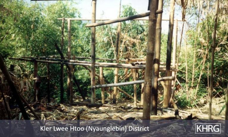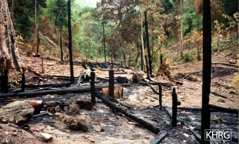 Hundreds of villages throughout the Karen areas of Karen State, eastern Pegu Division and Tenasserim Division lie deserted or burned to the ground, their populations having fled to the forest. In regions where resistance forces are believed to be active, it has become routine SPDC policy to burn and destroy villages and food supplies and to try to force villagers to relocation sites and garrisoned villages where they can be tightly controlled. Many villagers have been forcibly relocated several times in the past 20 years and would rather live in the forest than go again. They know that they can expect to find no food or assistance of any kind, no paid labour, no land to work and plenty of forced labour in the relocation sites, and that the conditions will eventually force them to flee into the forest anyway. After a while the villagers reestablish their villages, only for them to be burned when they are ordered to relocate once more. In Papun and eastern Nyaunglebin districts the SPDC has not even bothered to issue relocation orders to many villages, but has shelled and burned without warning over 200 villages since 1997. Hundreds more have been destroyed in other regions, displacing at least one to two hundred thousand people. Many of them are still in hiding in the forests, where columns come to burn their shelters and destroy their food supplies.