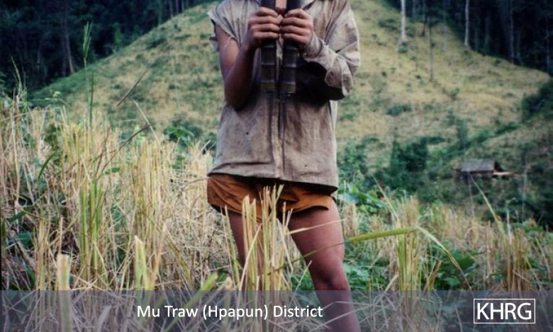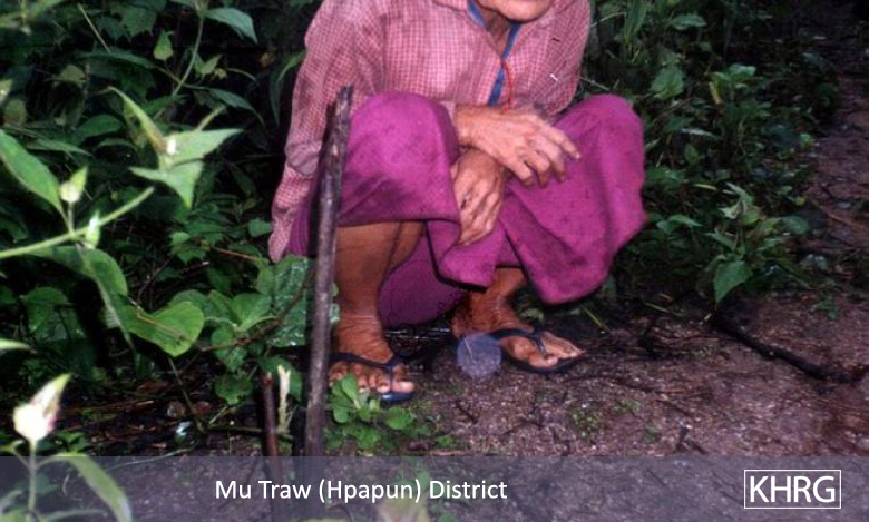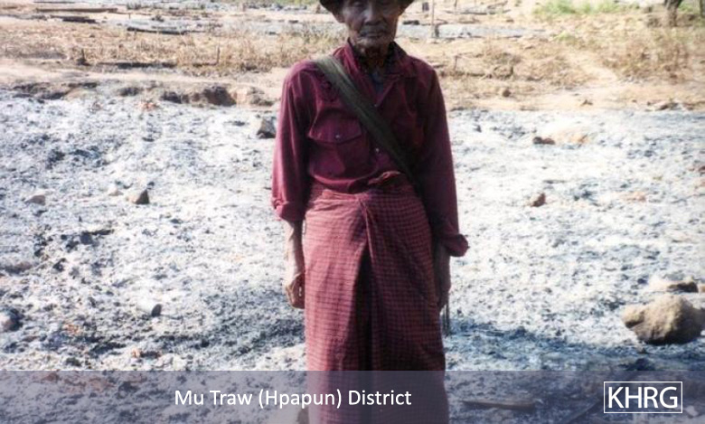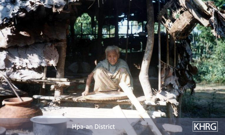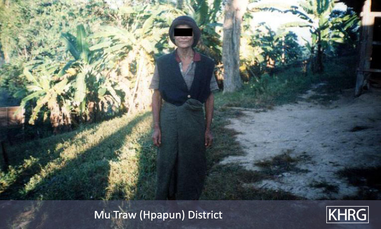 Photo #E25: Saw L---, 62 years old, is the village head of xxxx village, northern Papun District. He told KHRG researchers how on December 2nd 2001 SPDC soldiers from LIB #503 and IB #7 came to xxxx village and opened fire. Another villager, Saw P---, was injured in the left shoulder. Most of the villagers were able to take their belongings and run away, but the soldiers captured Naw P---, 50 years old, and took her with them for four hours. They then forced her to sit down, touched her with a gun and asked, “Do you want to die?” She told them, “If you want to kill me don’t torture me, just kill me immediately. I am already old. In my life I have only worked a hill field, but now I can’t work to get food anymore.” The soldiers then released her. [Photo: KHRG researcher]