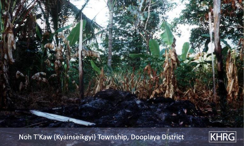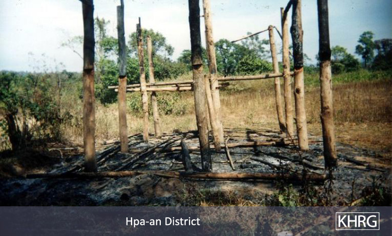 Photos #B27, B28, B29: On January 18th 2002, DKBA soldiers of DKBA #999 Brigade burned down houses and and destroyed the villagers' paddy in Day Law Pya village, Pa’an District. [Photo: KHRG researcher]
