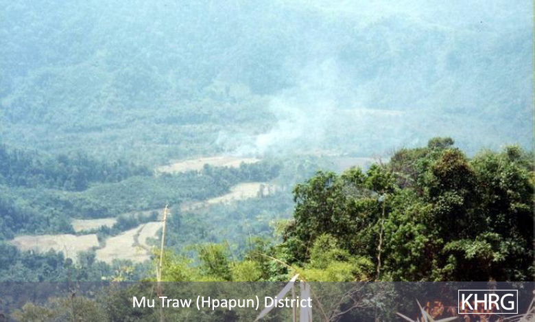 Photo #B38: On March 12th 2002, SPDC soldiers of LIB #207 entered Kheh Pa Hta village, western Papun District and burned it. The smoke from the burning village can be seen in the valley in the centre of the photo. The villagers fled further into the forest to avoid the soldiers. [Photo: KHRG researcher]