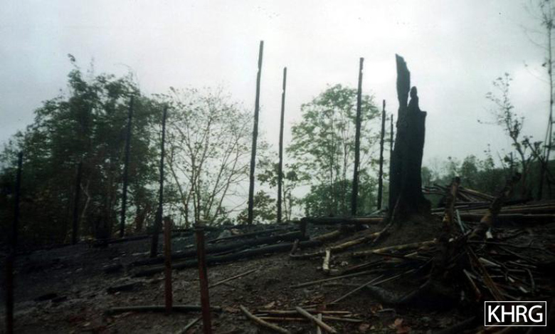 Photos #B44, B45, B46, B47, B48: The remains of houses in Kho Kay village after SPDC soldiers burned it on May 8th 2002. The soldiers also burned the paddy barns and destroyed whatever possessions they found hidden in the forest around the village. The village was an internally displaced villager hiding site which had become like a village because the villagers had been able to live there with a degree of stability for some time. Although the houses were built in clusters within site of each other and not next to each other, the soldiers went around and burned all of them except for one small hut (Photo #B45). [Photos: KHRG researcher]