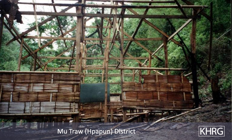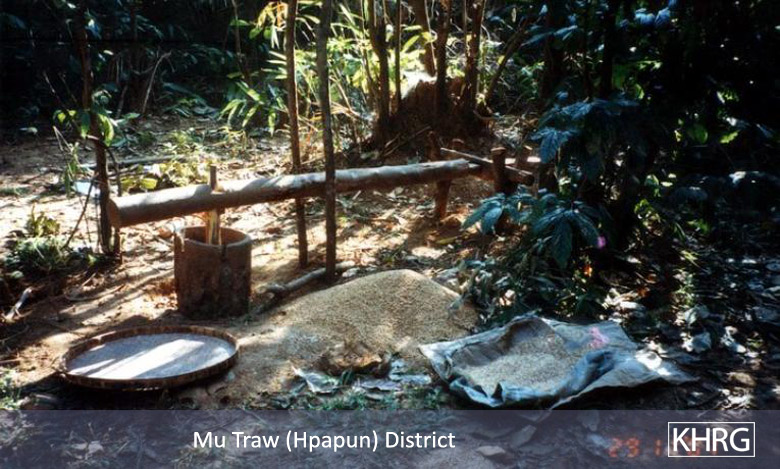 Photo #B54 B55, B56, B57, B58: On February 28th 2002, LIB #416, Battalion Commander Win Kyaw Oo, and LIB #83, Battalion Commander Min Naung, of LID #88, commander Ohn Myint, came to K’Toh Hta village in Kawkareik township, Dooplaya District. They accused the villagers of helping the KNLA and burned the entire village. Photo #B54 shows some of the small shelters that villagers built after the village was burned. In Photo #B55 the K’Toh Hta villagers received rice from sympathetic villagers from nearby villages. Photos #B56 and B57 show the remains of the villagers’ houses and photo #B58 is their rice mill after the attack. [Photos: KHRG researcher]
