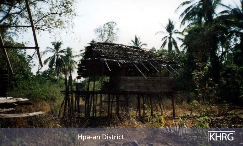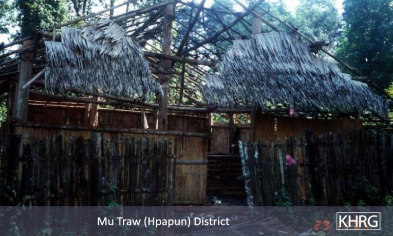 Photos #B74, B75: Two houses in xxxx village, southeast Pa’an District. A researcher from the area reported that 15 years ago the houses in this village were big and made of wood, but now there are no big houses anymore and the forests are gone. The villagers simply build small houses to stay in. The villagers no longer try to build big, wooden houses anymore because they no longer have the money and they see little point in building a house which may be destroyed. They simply make them with bamboo floors and leaf walls. Villagers only build houses with leaf walls as a last resort when there is no more wood or bamboo. When a researcher asked the owner of the house in Photo #B74 why he did not build a good house, he replied, "If I make a good house and there is fighting, the SPDC and DKBA will burn it and I will be sorry to lose the house.” SPDC and DKBA troops often burn villager's houses as punishment when fighting occurs in the area. [Photo: KHRG researcher]