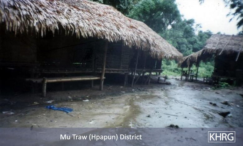 Photo #B59, B60: Deserted houses in K’Law Lu village, Pa’an District, after DKBA soldiers forced the villagers to leave the village in October 2001 and burned some of the houses. The DKBA laid landmines in the village after the villagers left and now the villagers are afraid to go back. [Photo: KHRG researcher