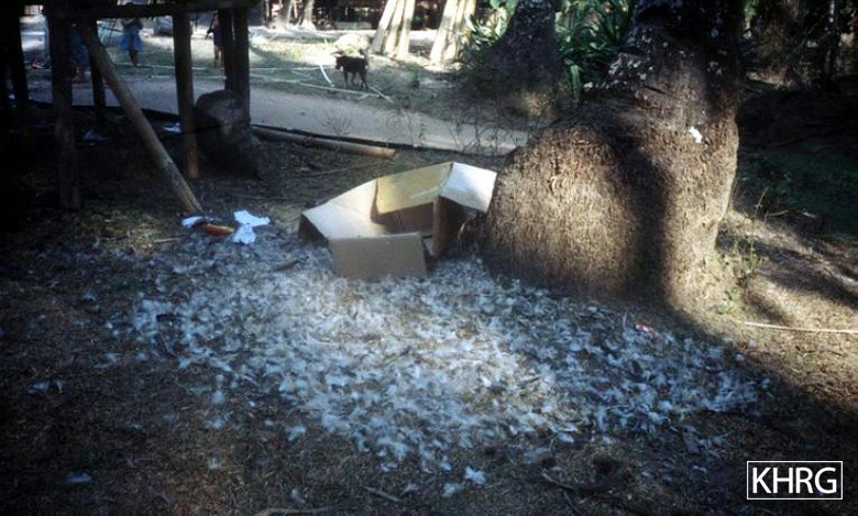 Photos #B68, B69: On February 12th 2002, LIB #102, LID #44 entered Toh Nyo village and looted the villagers’ belongings. They took machetes, clothes, pigs, chickens, coconuts and rice and did not pay for anything. The feathers under the tree are what remains of the chickens the soldiers killed and plucked to cook for their meal (Photo #B68). The soldiers slept in the village for a night and the next day went back to Paw Hta (Photo #B69) where they also stole the villagers’ belongings. SPDC soldiers climbed the coconut trees to steal the coconuts, drank the water from the coconuts and threw the rest away. The feathers on the ground are from chickens that they also stole and ate. These photos were taken the following day. [Photos: KHRG researcher]