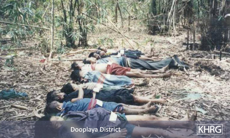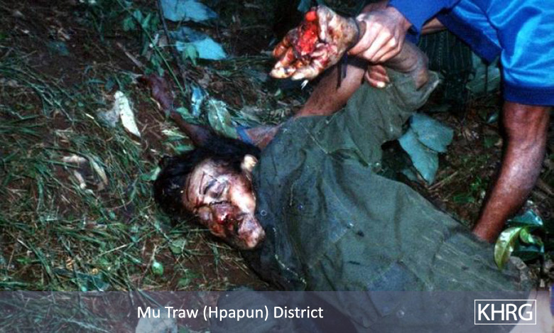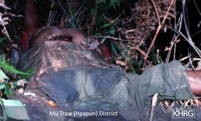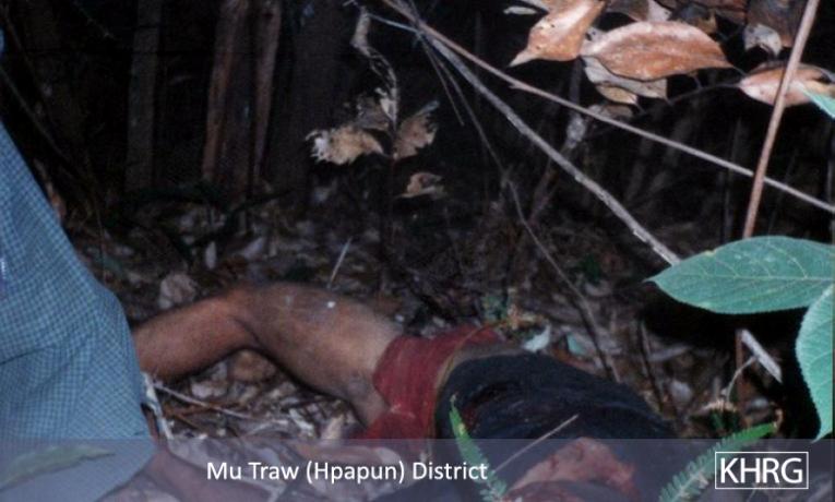 Photos #D21, D22, D23, D24, D25: The bodies of Saw H---, Saw D--- and Saw S--- who were shot dead by SPDC soldiers near xxxx village, northern Papun District. Soldiers of LIB #xxx and IB #yy had come down from Toungoo District in the north into Papun District. After shooting at villagers in their fields at yyyy and zzzz villages, the soldiers came to xxxx village on November 20th 2001. The villagers were holding a Christian worship service and did not know that the soldiers were approaching. When the soldiers opened fire the villagers scattered and ran away. Three children, Naw S---, 17 years old, Saw H---, 6 years old, and Saw T---, 8 years old, became separated from the other villagers and were lost in the forest for a day. Three of the villagers were killed. Saw D--- and Saw S--- (Photos #D22, D23, D24, D25) were shot together. Saw H--- (Photo #D21) the xxxx village head, was shot separately. All three men had children. The villagers went back after the soldiers had left, found the three men and buried them. [Photos: KHRG researcher]