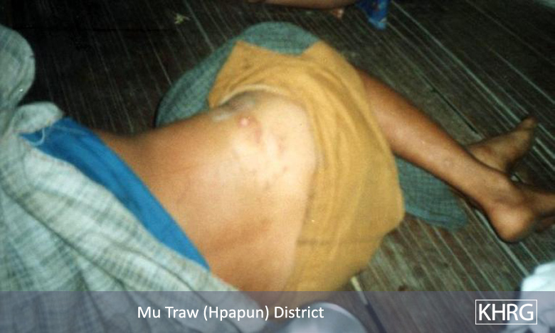 Photos #D4, D5, D6, D7: A group of villagers from Tee Law Bler village in Dooplaya District tried to flee to Thailand after being ordered to relocate in April 2002. They spent the night of April 28th in some rice field huts not far from their village. Soldiers of IB #78 found the villagers asleep in the huts and without investigating who was inside opened fire on them. Ten people were shot dead, six of them children: Saw Toh Paw (age 56), his wife Naw Hsa Ghay (51), their granddaughters Naw K'Ree Htoo (12) and Naw Bleh Po (5), Ma Htwe Yi (50), Naw Mu Tha (40), Mu Bpaw Bpaw (7), Saw K'Pru Mu (14), Naw Plah (5) and Naw Dta Baw (2). All but Saw Toh Paw and Saw K'Pru Mu were women and girls. Nine other villagers were wounded and left there by the soldiers. Naw Pee Lee, 45 years old, (Photos #D5 and D6) from Tee Law Bler village, was shot in the left breast. She was eight or nine months pregnant at the time. Her husband tried to care for her in the forest and after ten days she gave birth but the baby died immediately. She also died three days later on May 10th. Two of her five children had been among those who died in the initial barrage. The young boy in Photo #D7 was lucky to escape with only the injury to his left arm, although he will bear the scars of the attack physically and mentally for the rest of his life. [Photos: FBR]