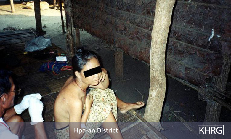 Photo #D65: Naw W---, a villager from xxxx village, was wounded when SPDC troops fired mortars into her village during fighting in the yyyy area of Pa’an District on April 8th 2002. She has an eight month old baby. This photo was taken on April 11th 2002. [Photo: KHRG researcher]