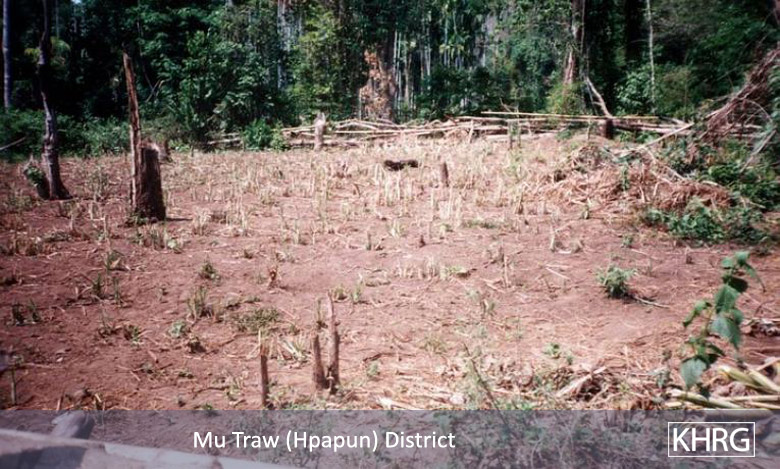 Photo #I20: The remains of a sugar cane field in eastern Papun District. SPDC soldiers ate or destroyed all the sugar cane when they stayed nearby in early 2002. No compensation was given to the villagers. Crops like sugar cane are grown by the villagers both for their own consumption and to sell or barter for rice or other foodstuffs. [Photo: KHRG researcher]