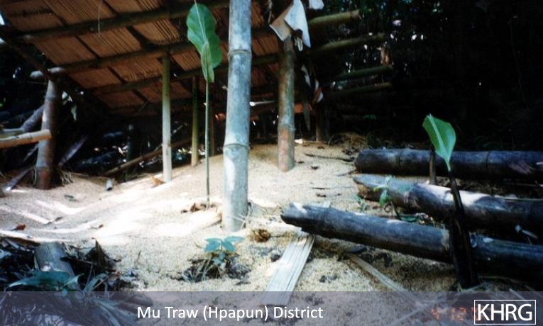 Photos #B61, B62: These houses in Lu Pleh township, Pa’an District were formerly the houses of the families of KNLA soldiers. The DKBA came during 2002 and threatened the families of known KNLA soldiers. The families do not dare to go back to their houses anymore and have moved to stay at an internally displaced villager site near the Thai border. [Photos: KHRG researcher]