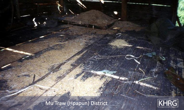 Photo #I22: Paddy which has been left behind by H--- villagers fleeing SPDC columns which have come to operate in Papun District. They did not dare to go back and take the paddy out of fear of being shot by the patrolling soldiers. [Photo: KHRG researcher]
