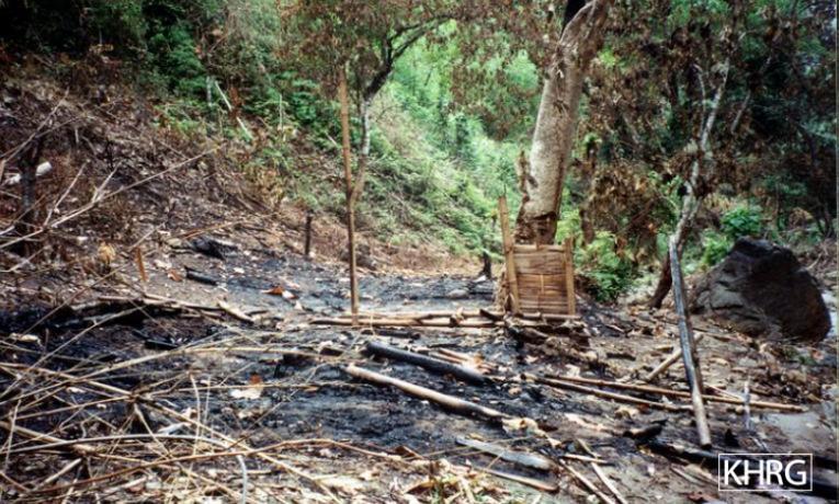 Photo #I25: The remnants of M---’s paddy, burned by soldiers of LIB #361 on February 15th 2002 in Nyaunglebin District. All 70 baskets [1,750 kgs. / 3,850 lbs.] of paddy were destroyed. This will leave M---’s family with very little, if any, food for the year. They will likely have to beg for food from others, buy food from another village or try to flee to a refugee camp in Thailand. [Photo: KHRG researcher]