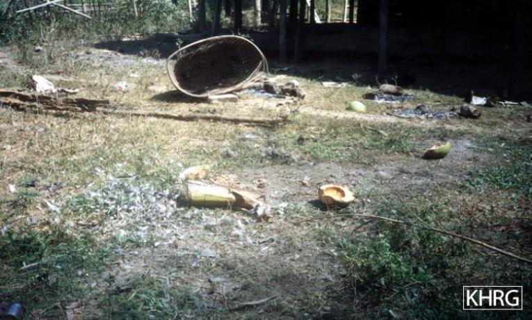 Photo #D63: Xxxx villager Naw M---'s husband was shot dead by SPDC troops of LIB #xx under Company Commander T--- on January 7th 2002. The soldiers saw Saw P--- running when they entered the village and immediately shot and killed him. The soldiers then searched the houses in the village and looted everything from the houses in the village. [Photo: KHRG researcher]