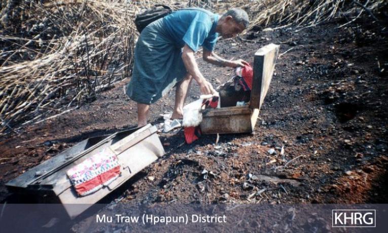 Photos #B72, B73: Villagers look through their chests for anything that remains after SPDC soldiers looted and burned possessions that they had hidden in a hut in Papun District. [Photos: KHRG researcher]