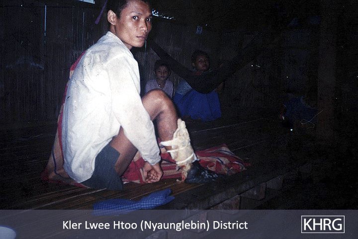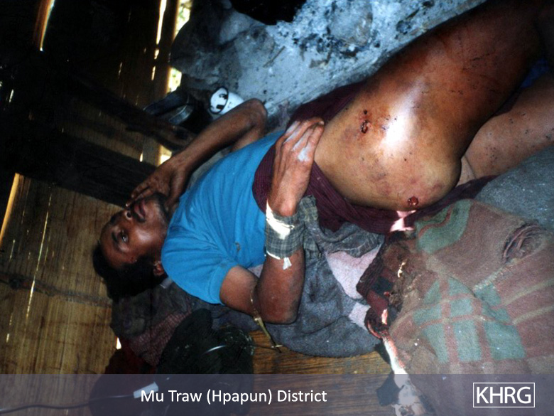 Photo #E135: Saw T---, a Karen animist from H--- village, Nyaunglebin District, was bitten by a poisonous snake while working in his hill field. The other villagers took him to a KNU clinic but there was no medicine there, so he was sent on to a KNU clinic in Papun District to the east. He was unable to go directly because of the operations of LIB’s #36, 364, 366, 367, 368, 369 and 370 of Sa Ka Ka #10 in the area. He had to wait for a month before he could reach the clinic. By the time he arrived there the poison had so damaged his leg that his foot had become black and had to be amputated below the knee. The photo was taken at the clinic prior to the amputation. Photos #D26: In December 2001 Saw D--- from xxxx village, northern Papun District, went to buy some medicine for his eldest child who was very sick. On the way back he was seen by SPDC soldiers of LIB #xxx and IB #yyy led by commander A---. The soldiers shot at him and he was hit by two bullets. One bullet entered his right buttock and exited his hip and another hit him in the calf. He crawled to escape until he fell unconscious. The soldiers cut his bag off him and took all the medicine he had bought for his son. They then placed a ‘People’s Army’ magazine in his bag and left it with him. Saw D--- laid unconscious in the forest for two days before villagers found him. He could not talk or walk when he was found and he was very cold. The villagers took him home and found a medic to treat him. He felt better after he was able to eat some rice porridge. [Photos: KHRG researcher]
