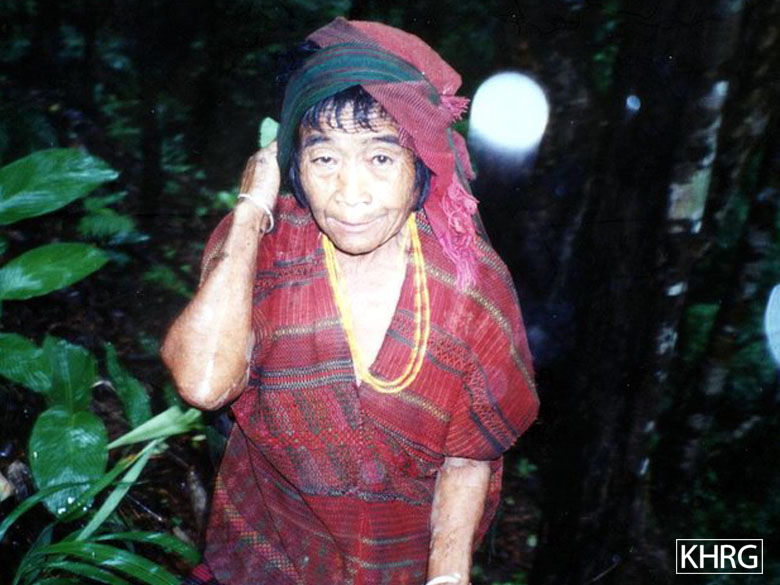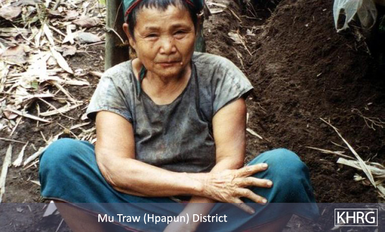 Photo #E121: Naw T---, 80 years old, was working in her hill field when KNLA and SPDC soldiers encountered each other nearby and fighting broke out. When she looked around she saw people fleeing past her hill field. She had not fled yet, but when the people came near her they shouted, “Let’s run, Auntie!” She then fled and climbed a hill to escape. When a KHRG researcher met her she was tired and breathing heavily with her mouth open and unable to talk. [Photo: KHRG researcher]