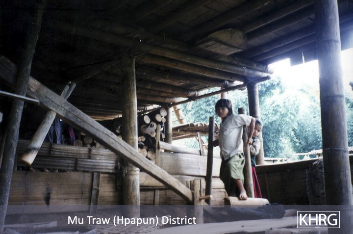 Photo #E107: On February 20th 2002, SPDC soldiers of LIB #xx under Battalion Commander T--- entered L--- village in Thaton District at five in the evening in search of villagers to take along as forced labour porters. All the single men in the village fled to avoid being taken as porters. [Photo: KHRG researcher]