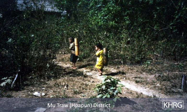 Photos #E125, E126: These two small children from D--- village, Papun District, are carrying water in the bamboo tubes on their backs for their mother to drink. Their mother is sick and their father was shot dead by SPDC soldiers in 2001. Children are often forced to grow up early and take on responsibilities far beyond their age. This is especially so for children who have lost a parent or are living in hiding in the forest. [Photos: KHRG researcher]