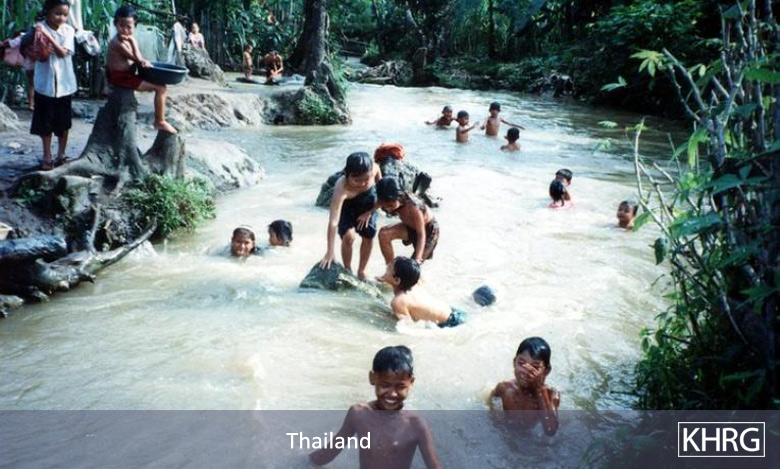 Photo #E127: Refugee children in Nu Po refugee camp in Thailand playing in a stream which runs near the camp. Opportunities for play such as this are infrequent for children in Burma. [Photo: KHRG researcher]