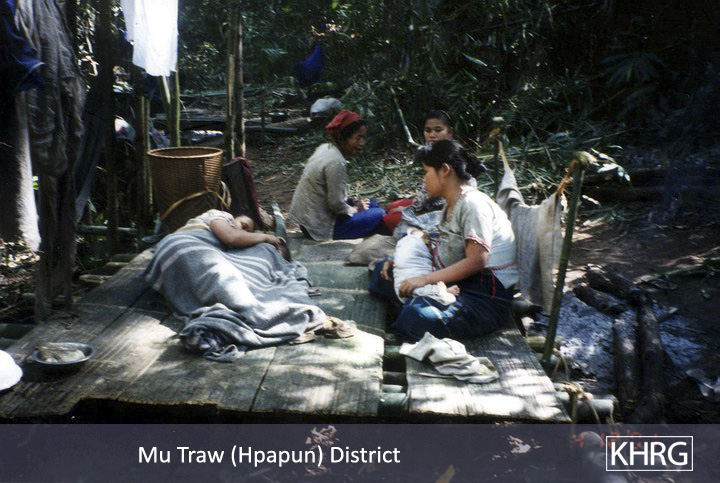 Photo #E73: H--- villagers in Nyaunglebin District take a break while fleeing SPDC soldiers in December 2001. The villagers did not dare to stay in their village anymore after SPDC troops began operating in the area. [Photo: KHRG researcher]