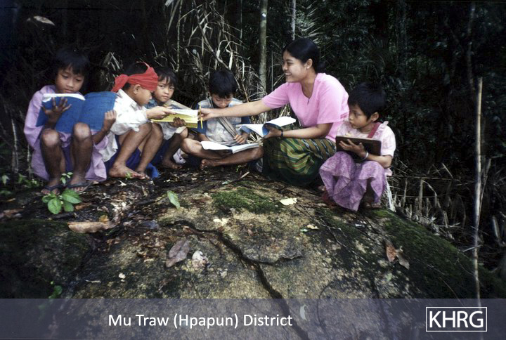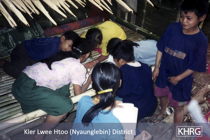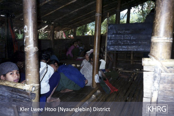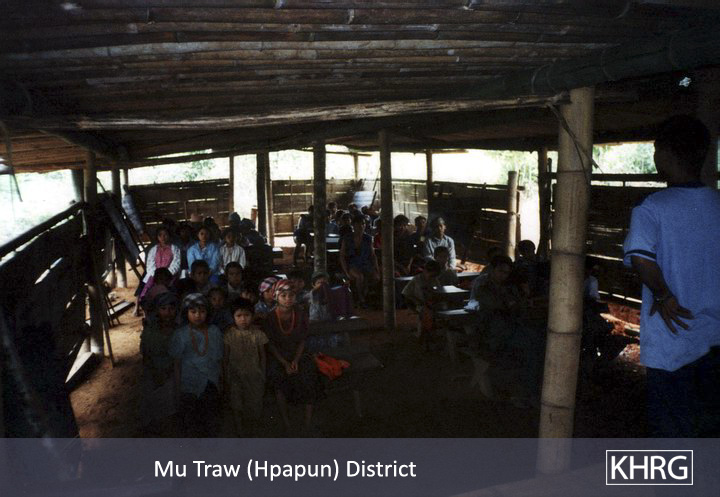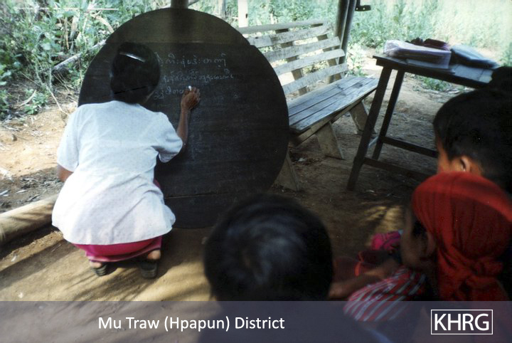 SPDC columns sent to destroy villages usually target the school and other community buildings first. The children of the displaced villagers lose any access to whatever education they previously had. Their parents often lament this fact when speaking to KHRG researchers in the field. The value that these people place on education becomes very clear when you come upon a group of villagers in the forest, living on the ground in lean-to shelters of leaves with almost nothing to eat and on the run from SPDC troops, yet with a rudimentary blackboard set up between the trees and one of the villagers teaching the children to read and write.