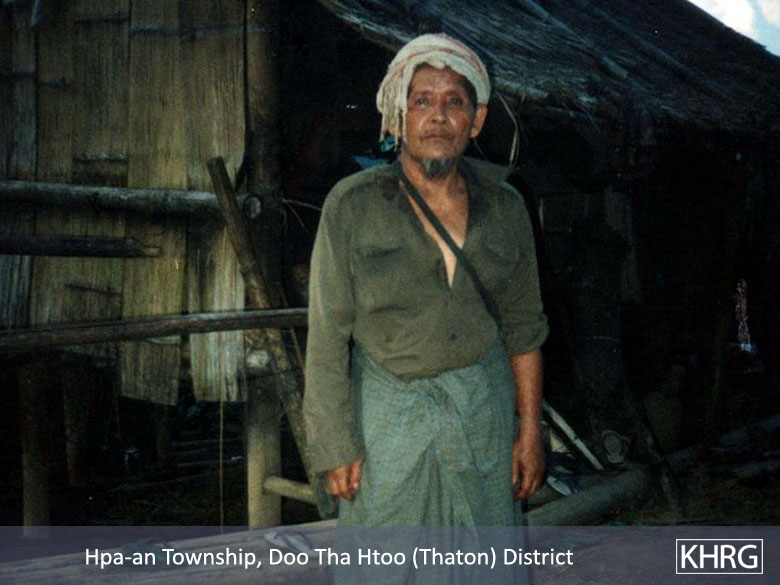 Photo #E29: Saw P---, 56 years old, is a hill field farmer from M--- village in Papun District. He had to flee along with the other villagers from his village when SPDC soldiers of LID #33 entered T--- village which was only a half hour away. They had to leave their hill fields behind when they fled and now must face difficulty in finding enough food to eat. [Photo: KHRG researcher]