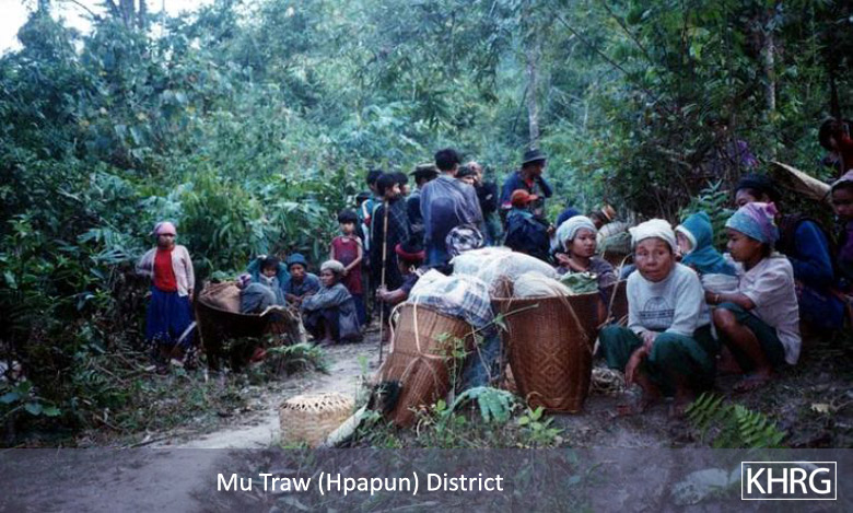 Photo #E65: Villagers from T--- village in eastern Papun District rest on their way to the xxxx River in January 2002. They no longer stay in their village since the SPDC burned down the village and the paddy barns and destroyed all of their belongings in December 2001. They have nothing left to eat. [Photo: KHRG researcher]