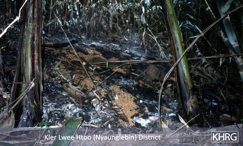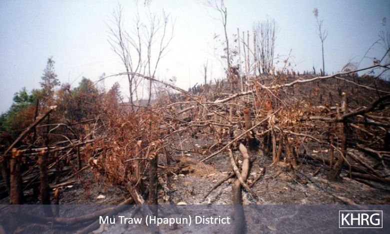 Photo #E118: This dry-season road was built by the SPDC beginning at Pwa Ghaw Hta village in northern Papun District and continues through Pla Koh, Tay Mu Der, Kaw Lu Der, Ku Koh, Ler Maw Ku Ter, Pweh Nee Htee Khoh Kyo and Kyu Lu villages. The villagers from all these villages and others close to the road have all fled into the forest to escape the soldiers in the camps along the road and the labour they would be forced to do building and repairing the road. Some villages still kept fields near the road, but they did not dare to work them this year because the soldiers came and burned the fields prematurely. [Photo: KHRG researcher]