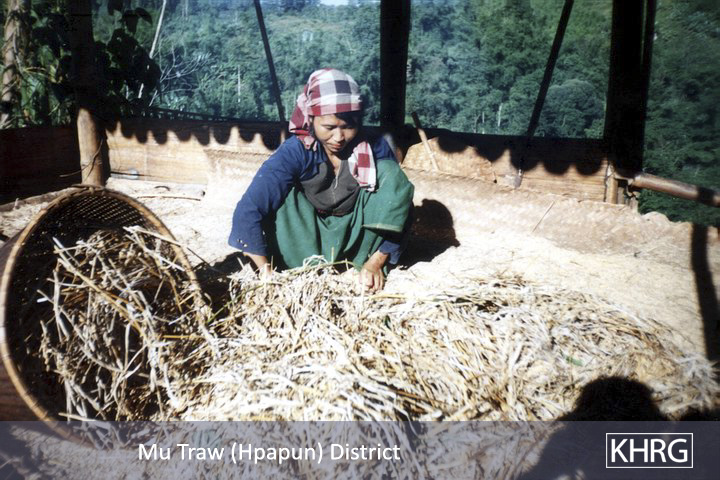 The photos below also show some of the struggles the internally displaced villagers must face in getting enough food to survive. Their struggle is made all the more difficult by the SPDC's operations to destroy their crops and their food caches. The lives of internally displaced villagers are constantly at risk whether they are planting a small crop in a hill field, hiking to an SPDC-controlled village to buy rice to carry back into the hills, or retrieving a basket of rice from a hidden rice storage barn. Depending on their luck, some villagers are able to survive this way for months or years, but eventually most of them find themselves driven into starvation and they have little choice but to flee to another area or head toward the border with Thailand. In the captions below, paddy is the term used to refer to rice off the stalk which has not yet been husked. Villagers dry the paddy and store it in paddy barns before pounding small amounts of it to husk it in preparation for cooking.