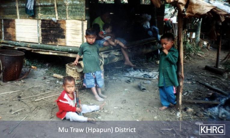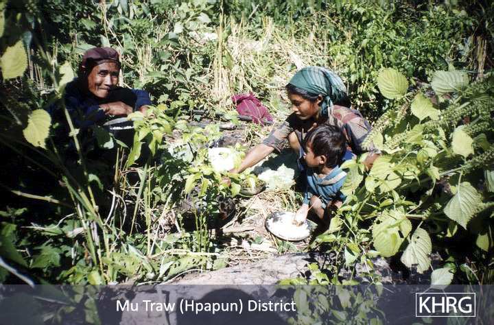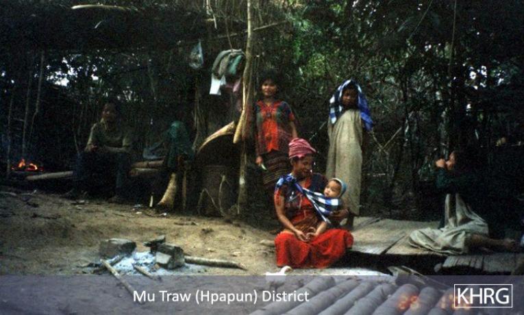 Photo #E92: This family from K--- village in eastern Papun District does not have any rice or paddy anymore and they can no longer work their hill field because the SPDC troops are operating in the area. They have to go and ask for food from other villages. To do this they have to avoid patrolling SPDC soldiers and hope that they do not step on a landmine. They told a KHRG researcher that they are afraid to go, but they have to do it anyway. [Photo: KHRG researcher]