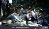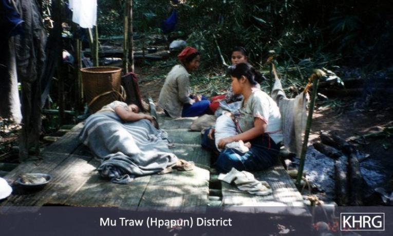 Photo #E73: H--- villagers in Nyaunglebin District take a break while fleeing SPDC soldiers in December 2001. The villagers did not dare to stay in their village anymore after SPDC troops began operating in the area. [Photo: KHRG researcher]
