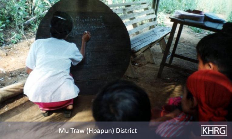 Photos #H6, H7: The interior of xxxx primary school, Pa’an District, during a lesson in November 2001. This school is under SPDC control and the primary school teacher receives a salary from the SPDC of 4,500 Kyat per month. This salary is not enough, because the teachers who must buy their own food and are subject to the same demands for forced labour and fees that the other villagers. [Photos: KHRG researcher]