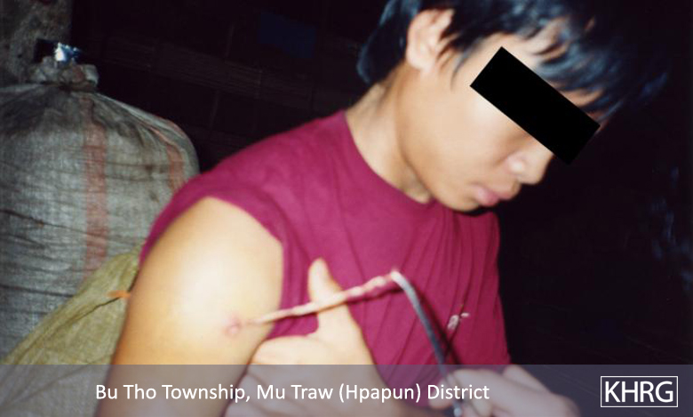There is also the constant danger of being shot by SPDC columns (see Section 5, Shootings and Killings ) or stepping on landmines (see photos 11-11 and 11-12 to 11-15 , and other photos in Section 11 [Landmines] ). Landmines are laid by all armed forces in these areas and are seldom removed. KNLA forces are the only ones to try to inform the villagers of which pathways are mined, but the information they provide is insufficient and many villagers still detonate their mines. Villagers who survive shootings or stepping on mines carry the resulting disabilities for their entire lives, particularly because proper treatment is unavailable (see photos 11-48 to 11-49 and 5-77 ); while more still suffer the effects of previous forced labour (see photo 10-147 ) and other SPDC abuses.