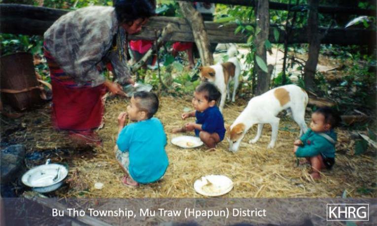 The difficulties involved require that every family member become actively involved in food production, which also means that every family member is exposed directly to being shot on sight, stepping on landmines, and other dangers. Some families have already lost family members, which only puts a greater burden on the others (see for example photos 5-31 to 5-32 , and Sections 8.3 [ Women, Livelihoods and Displacement ] and 9.4 [ Orphans ]). Villagers also take measures to make food supplies last longer, such as eating rice porridge instead of steamed rice (see photo 10-141 ), and rely heavily on forest foods they would eat less in the village, like bamboo shoots, banana trees, and various roots. Some of these, like klih roots, are semi-toxic and require a lot of processing and would not generally be eaten in the village, but become foods of last resort in the forest. For those who cannot produce enough, others always share what they can. Karen relief teams also move through these areas with aid to improve food security (see photos 7-85 to 7-87 ), but they are under-resourced and can only reach a minority of IDPs on a regular basis.