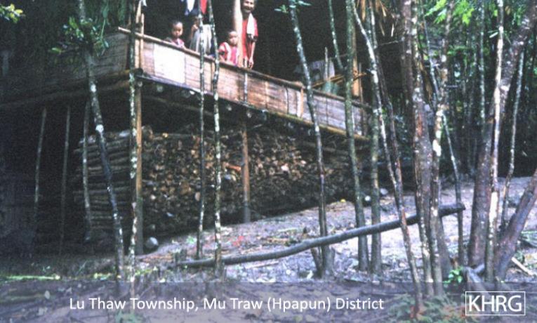 Photo #10-103: An IDP hiding site in Saw Mu Plaw village tract, Lu Thaw township, Papun district in February 2003. There are 12 villages in this tract, but the SPDC destroyed all of them in 1997 and since then the villagers have had to live in hiding in sites like this, regularly moving when SPDC Army units are around. [Photo: KHRG researcher]