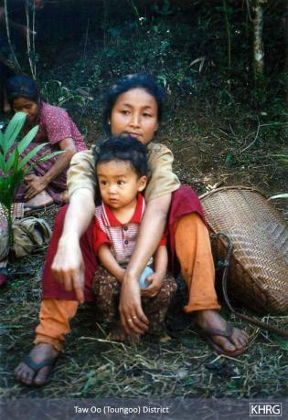 Disease and malnutrition kill more displaced Karen villagers than are killed by SPDC troops. Once displaced it is difficult to obtain a stable supply of food good enough to avoid malnutrition, and if people are in a forced relocation site or far from their village they are forced to rely on unknown and often unclean water supplies. Displaced villagers are exposed to malaria, dysentery, typhoid, tuberculosis, dengue fever, encephalitis and a host of other illnesses, infections and parasites, and often also fall prey to oedema, goitre, and other conditions brought on by dietary deficiencies. Frequently forced to sleep in the open, they are very vulnerable to mosquito-borne illnesses like malaria, dengue and encephalitis. Children (see photos 10-3 to 10-4 ), the elderly, and pregnant and nursing women (see photos 8-10 to 8-12 ) are the hardest hit groups. Many women fall ill because they are weakened by the multiple burdens of producing and foraging for food, caring for children, and being on the move, increasing their vulnerability to all of the threats already mentioned (see photos 8-8 and 8-9 ). Many mothers give birth in the forest in unsanitary conditions and with little or no help (see photos 8-15 , 8-17 , and 8-24 to 8-25 ). Maternal and child mortality and morbidity are both extremely high (see photos 8-13 and 8-18 to 8-19 ).