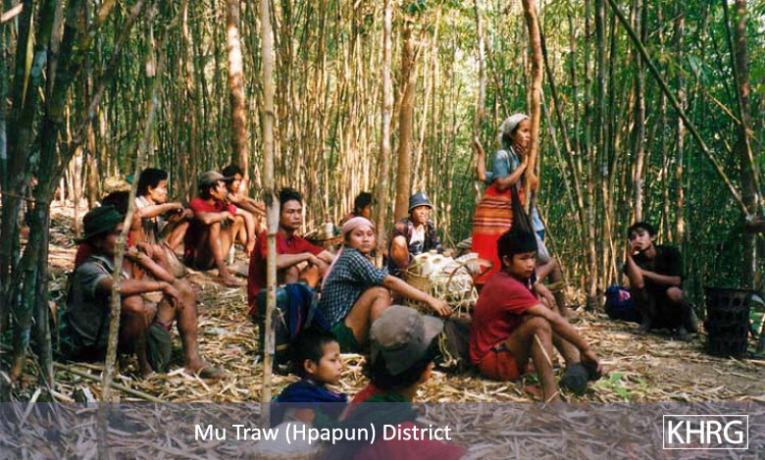 Photo #10-100: These villagers from P--- village, Bu Tho township, Papun district decided to leave in April 2003 and build a hut in the hills because the SPDC troops in their area always forced them to porter and stole their livestock. Here they are stopping on their way to eat some rice they brought along. [Photo: KHRG researcher]