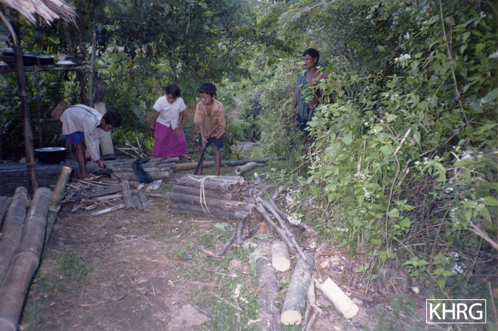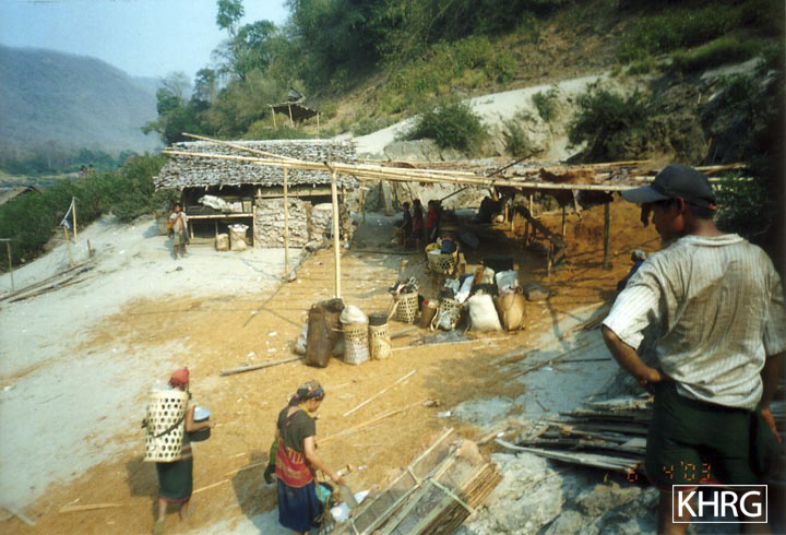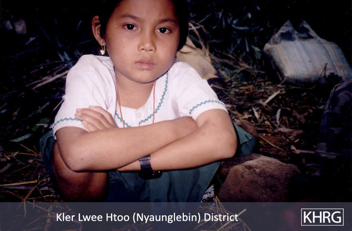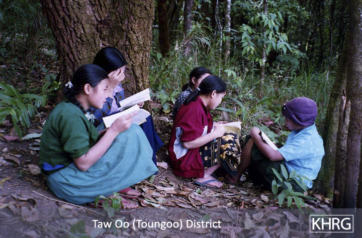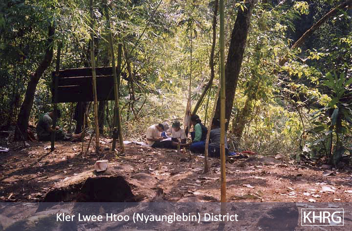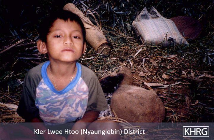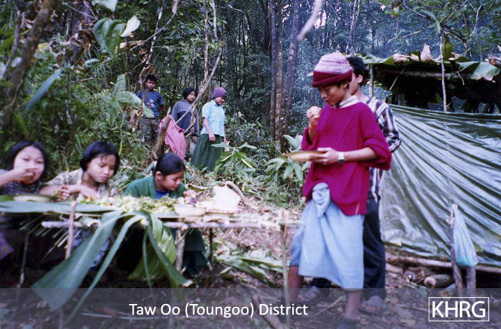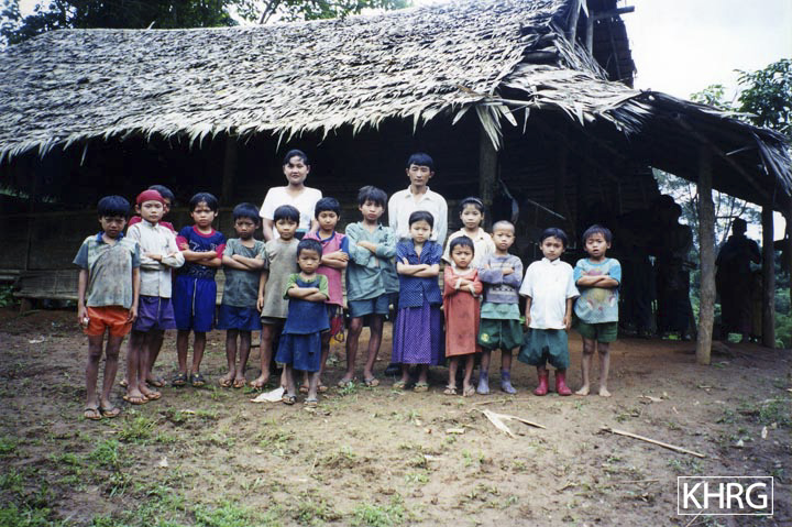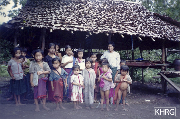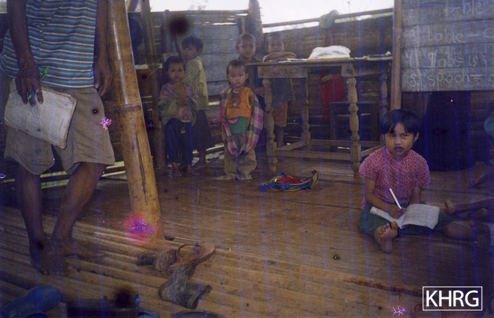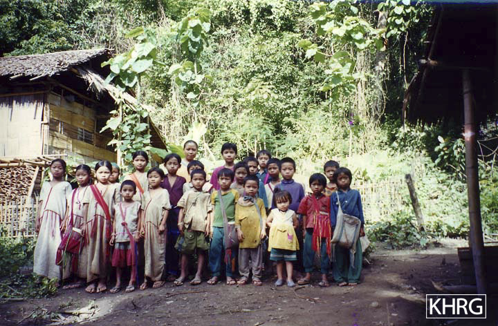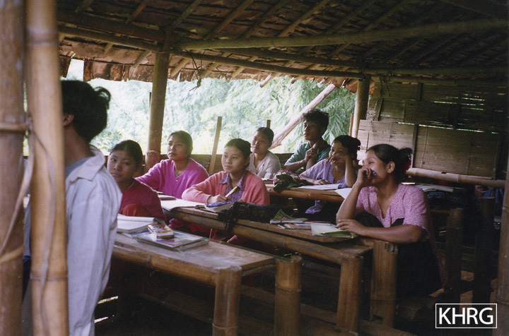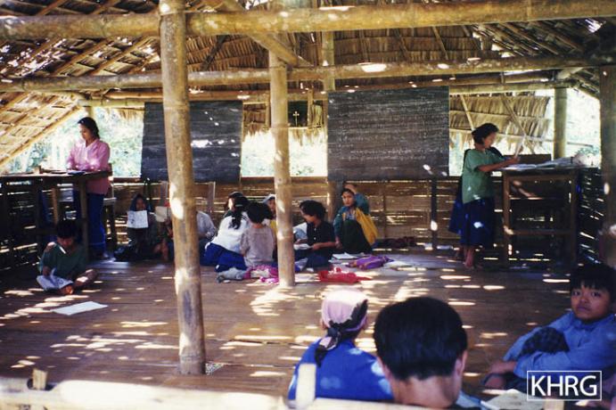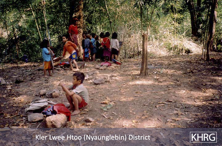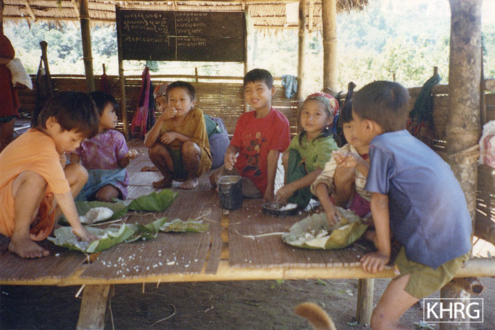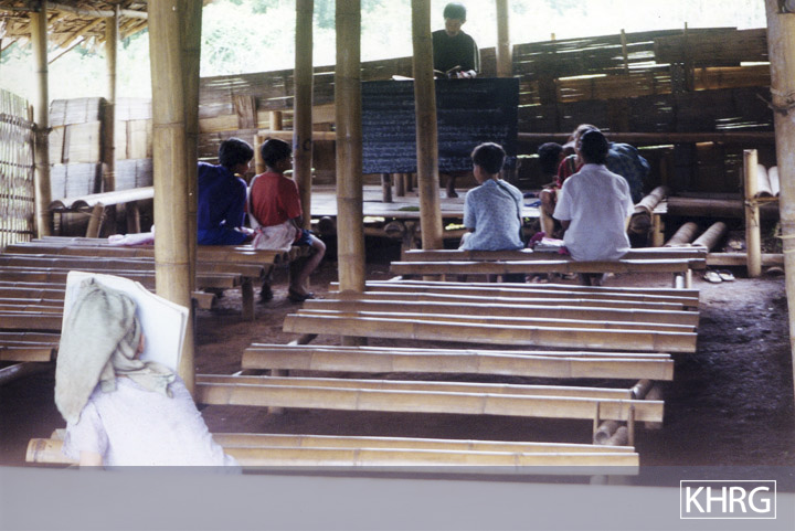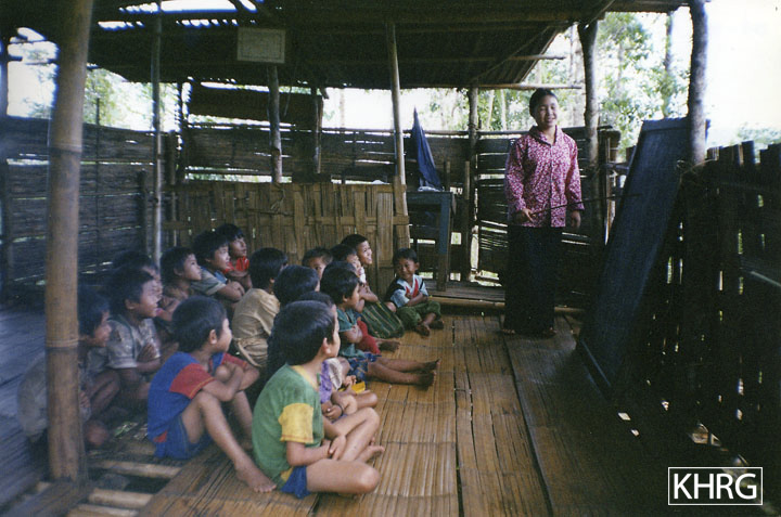 Photo #9-26: A primary school set up by internally displaced villagers for their children in the forest where they are hiding near H--- in Tantabin township, Toungoo district. This photo was taken in August 2004. Photos #9-27, 9-28: This high school (9 th and 10 th Standards) for internally displaced students was set up by the people of several villages in K--- area of Tantabin township, Toungoo district with help from the KNU. It is extremely rare for internally displaced villagers to have access to any education beyond primary school. However, this school is close to an SPDC Army camp, so it regularly has to close when SPDC patrols are active, and the students have to return to their hiding sites. These photos were taken in August 2004. Photo #9-29: Students of a newly opened primary school for internally displaced villagers in H--- village, Dweh Loh township, Papun District in July 2003. The students do not have enough books or pencils. They were unable to open the school sooner because they were unable to find any teachers. Whenever the SPDC Army troops come close to where they have set up the school in the forest, the students must flee back to their homes. Should the soldiers come closer, they have to desert their homes and flee deeper into the forest. Photo #9-30: On April 5 th 2002, SPDC IB #83 Column #1 (Column Commander Win Kyaw Oo commanding) ordered all villagers in P--- village to relocate to an SPDC relocation site at K'Lay Kee, a road junction on the vehicle road from Kya In Seik Gyi to Kyaikdon ( see map ) in Kya In township, Dooplaya District. There was no school in the relocation site where the children could learn. In 2003, some of the villagers fled the relocation site when they could no longer endure the forced labour and other SPDC demands. They resettled in their old village, built a small school and hired a teacher from a neighbouring village. The poverty caused by the forced relocation is reflected in the lack of footwear on most of the pupils, and the nakedness and distended stomachs of two of the students on the right. Regardless, education is seen as a priority by the villagers. Photo #9-31: This school in P--- village of Bu Tho township, Papun District must close whenever they receive word of an approaching SPDC Army column. If the soldiers were to see them, they would very likely be either shot on sight or arrested and forcibly relocated to an SPDC relocation site. Columns frequently burn schools like this in a deliberate attempt to erode village solidarity and community. This photo was taken in January 2003. Photo #9-32: Naw T---, 19 years old, teaching a lesson to her students at the P--- internally displaced village in Than Daung Township of Toungoo District in November 2002. Having to close whenever SPDC patrols are around, her school can stay open on average only one week out of every month.Photo #9-33: This is the school at D--- hiding site in Lu Thaw township of Papun District. This school is typical of schools set up by internally displaced villagers in that it is severely lacking in supplies; without enough books, pens, and pencils for the students, or enough food or money to support the teachers. Even so, teachers or untrained villagers volunteer their time to continue their children's education. Whenever SPDC Army units draw near, they must suspend all classes as they flee further into the forests. Photo #9-34: Internally displaced children from P--- village in Dweh Loh township of Papun District working to help their families survive. The rigorous demands of life in the forest leave little time for education. Photo #9-35: Students take a break for lunch while studying at the P--- school in Dweh Loh township of Papun District in October 2002. The villagers who send their children to this school are living scattered in small nuclear units in the forests, hoping to avoid detection by SPDC forces. Living in large groups requires clearing more hill fields, which can give away their position, while living in small groups allows them to remain fairly inconspicuous. Each group of children has brought their own rice wrapped in leaves, though as the picture shows they have very little to eat with it. [Photo: KHRG researcher]