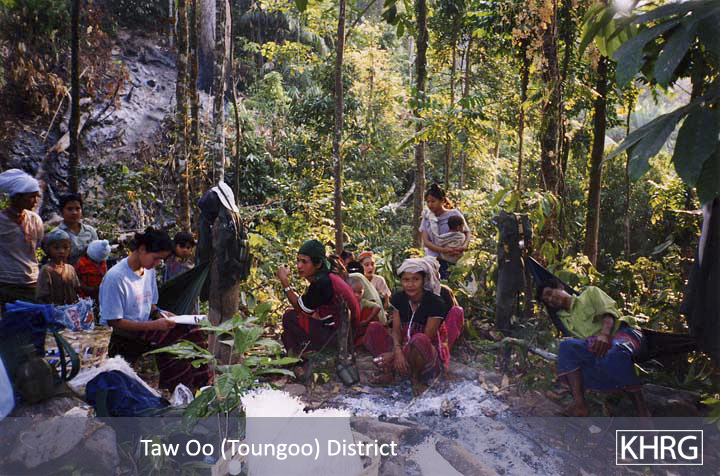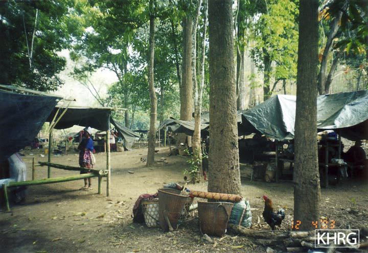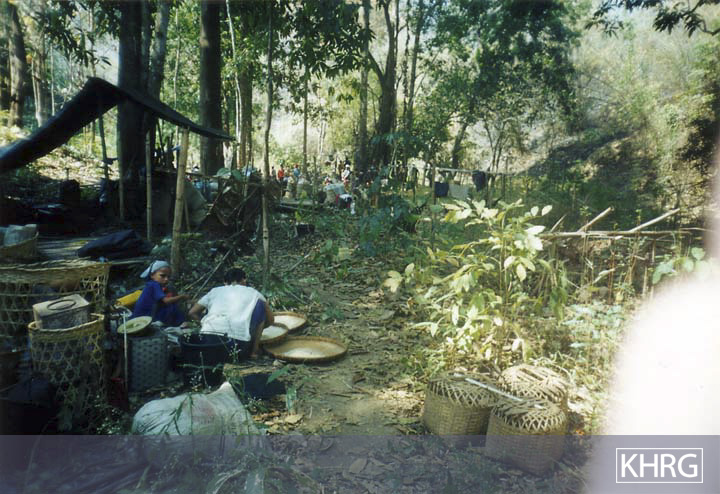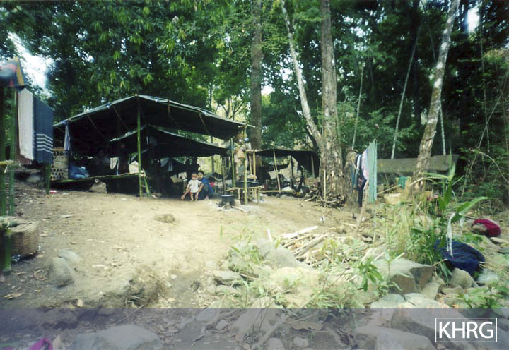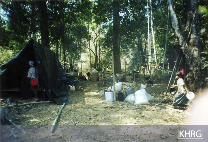 Photos #10-170, 10-171, 10-172: Following up on the photos immediately above, these photos taken in mid-April 2003 show the villagers from Ho Kay over a month later, still in their hidden shelters on the Thai side of the Salween River. Even here they are not safe from pursuit by SPDC forces, and if they are found by Thai forces they would be forcibly repatriated at gunpoint. Their only longer-term options are to sneak into a refugee camp without being caught en route by Thai authorities, head to a Thai town to work illegally, or return across the border. In the end some went back to their villages after SPDC troops withdrew, while others found their way to a refugee camp. Photo #10-173: This group of villagers had been internally displaced in the forests for years when this photo was taken in March 2003, but they were on their way to Thailand because they said the level of SPDC Army activity in their area was making it impossible to live there any more. [Photos: KHRG researcher]