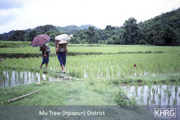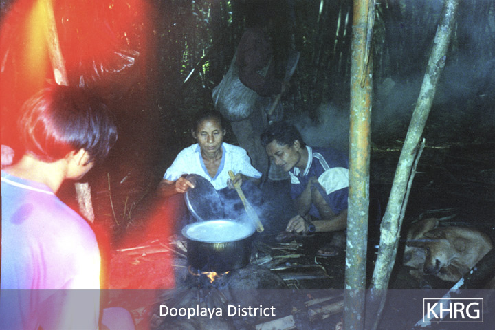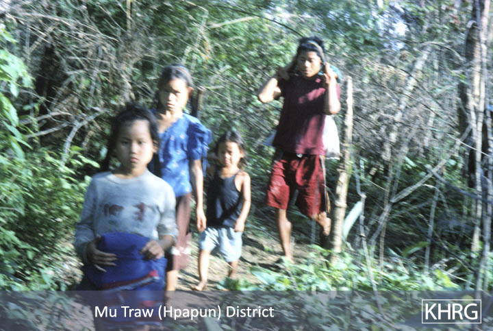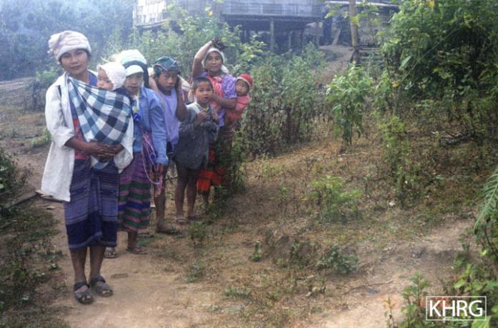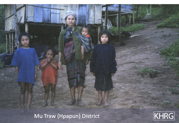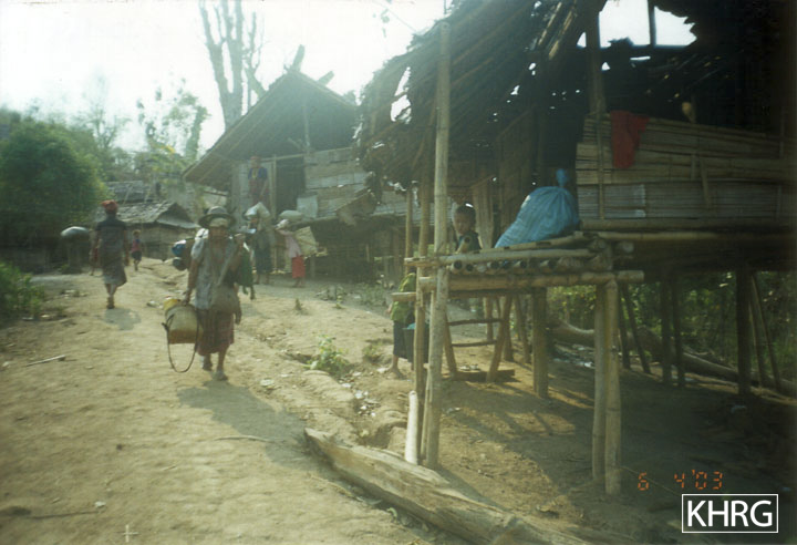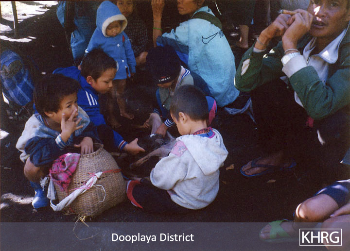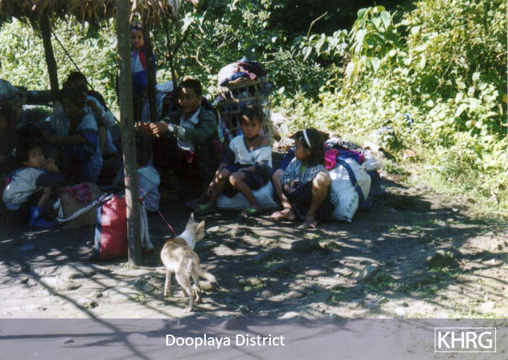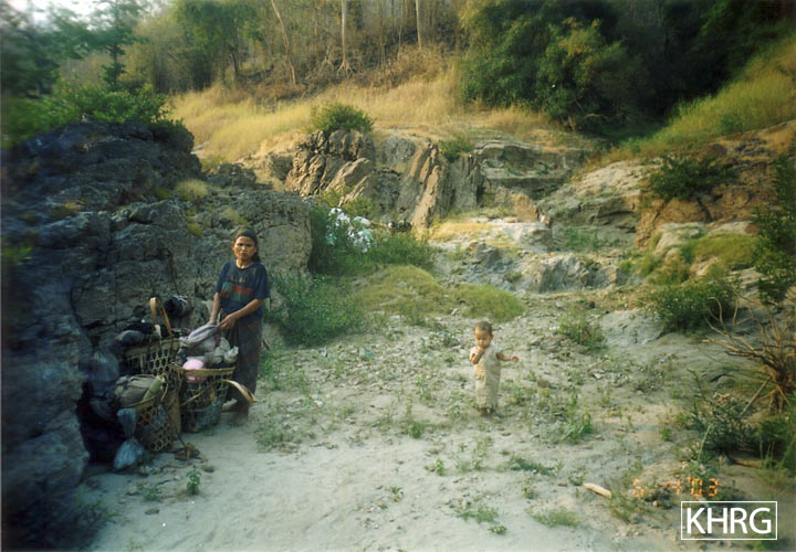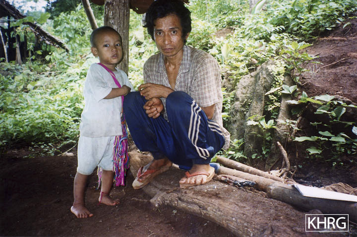 Photos #10-162, 10-163: These families are from P--- village in Kawkareik township and K--- village in Kya In township, Dooplaya district. In January 2003 they could no longer abide the forced labour and arbitrary abuses and demands imposed on them by the SPDC forces controlling their area, so they fled across the border to Thailand. They were promptly forcibly repatriated by Thai authorities, however, and when these photos were taken they had just arrived back in Karen State and were wandering uncertain where to go; they told a KHRG researcher they had "No money to pay and no land to stay." [Photos: KHRG researcher]