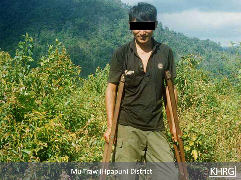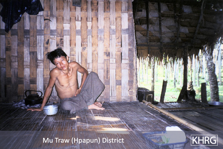 Photo # 3-3: Saw T---, age 40, from T'Nay Hsah township, Pa'an District fled to a refugee camp in Thailand with his family after DKBA soldiers relocated them and planted landmines in their village. On May 16 th 2004, soldiers from DKBA #999 Brigade Special Battalion forcibly relocated a number of villages in T'Nay Hsah township of Pa'an District to nearby Wah Klu Pu village. After the villagers had been relocated the soldiers planted many landmines on the paths leading into their home villages and in the villages themselves to deter the villagers from returning. As a result, the villagers no longer dare to return to their homes to collect their food or any of their belongings for fear of stepping on one of the mines. This photo was taken in July 2004. [Photo: KHRG researcher]