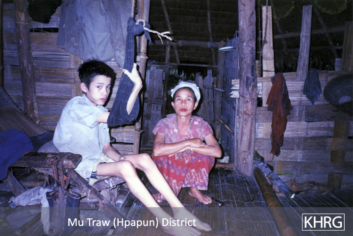 Photo #10-148: Naw W---, 40, and her 15-year-old son Saw P--- in their house in T--- village, Bu Tho township, Papun district. On August 15 th 2002, a column of LIB #9 led by deputy battalion commander Myo Myint came into their village. Everyone else fled, but because Saw P--- cannot walk he and his mother had to stay alone and face the soldiers. Fortunately the soldiers did nothing to them, but when this photo was taken two weeks later they were still alone in the village. [Photo: KHRG researcher]