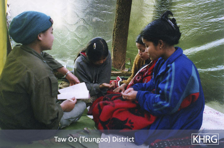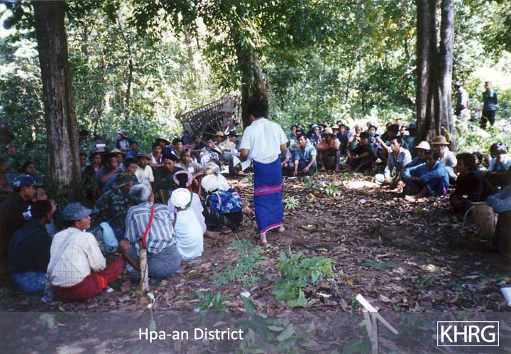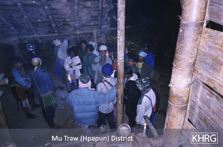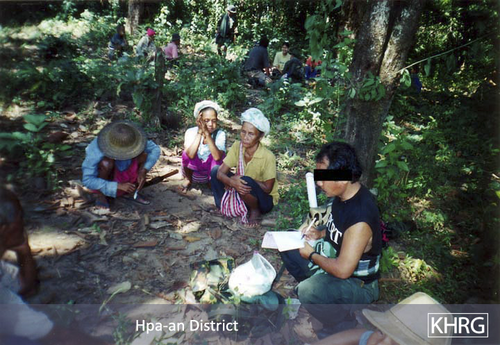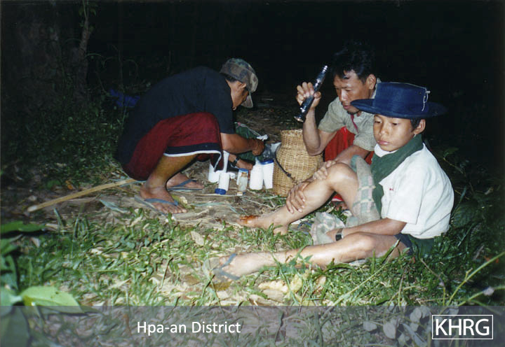 Photos #10-149, 10-150: Members of 'backpack' medical teams operating covertly in Karen areas gather villagers to meetings to talk about health and to treat the sick in Pa'an District in mid-November 2002. Photos #10-151, 10-152, 10-153: Medics from mobile medical teams treat internally displaced villagers in the forests of Pa'an District covertly in November 2002. [Photos: KHRG researcher]