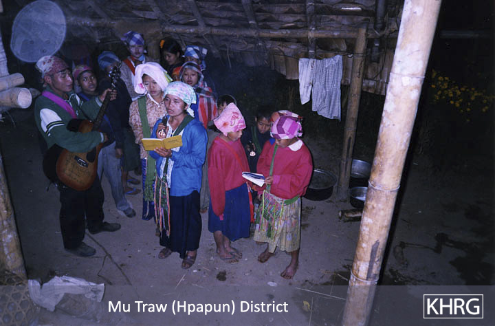 Photos #10-157, 10-158: Students in two villages in western Papun District sing by night in the days leading up to Christmas 2004. Both of these schools lack books, pens, and material support for the teachers and they regularly have to flee mobile SPDC patrols based nearby, but schooling (and singing) continue whenever possible. [Photos: KHRG researcher]