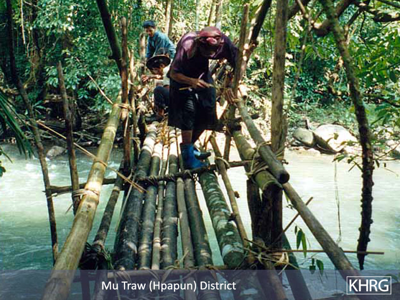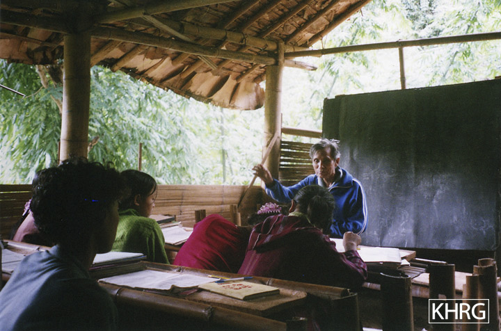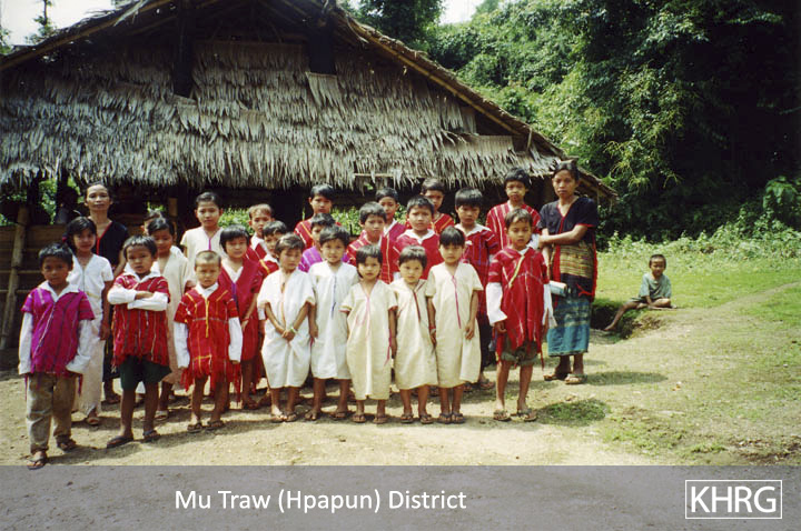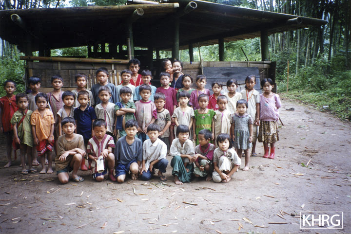 Photos #10-160, 10-161: This primary school at T--- in Lu Thaw township, Papun District, was set up by internally displaced villagers who live scattered in small groups throughout the forest in the area to avoid detection by SPDC patrols. Children from a number of these different groups come together to receive an education, many of them crossing the bridge shown in photo 10-161 to get to school each day. The school has to close whenever SPDC patrols are active in the area, so it is only open part of the time. These photos were taken in August 2002.Photo #9-37: Students and teachers of the school at L--- hiding site in Lu Thaw township, Papun District. This school only teaches classes from Kindergarten to Third Standard (Grade 3). Very few IDP schools are able to teach beyond primary school (Fourth Standard) level because most of the teachers never had a chance themselves to study beyond Fourth Standard. This photo was taken in July 2002. Photo #9-38: Students and teachers at a school set up by internally displaced villagers at T--- in Lu Thaw township, Papun District. Whenever the villagers hear of an approaching SPDC column, they must close the school and flee deeper into the mountains. This photo was taken in July 2002. [Photos: KHRG researcher]